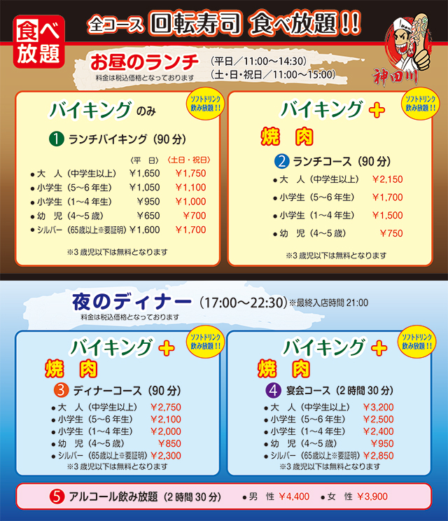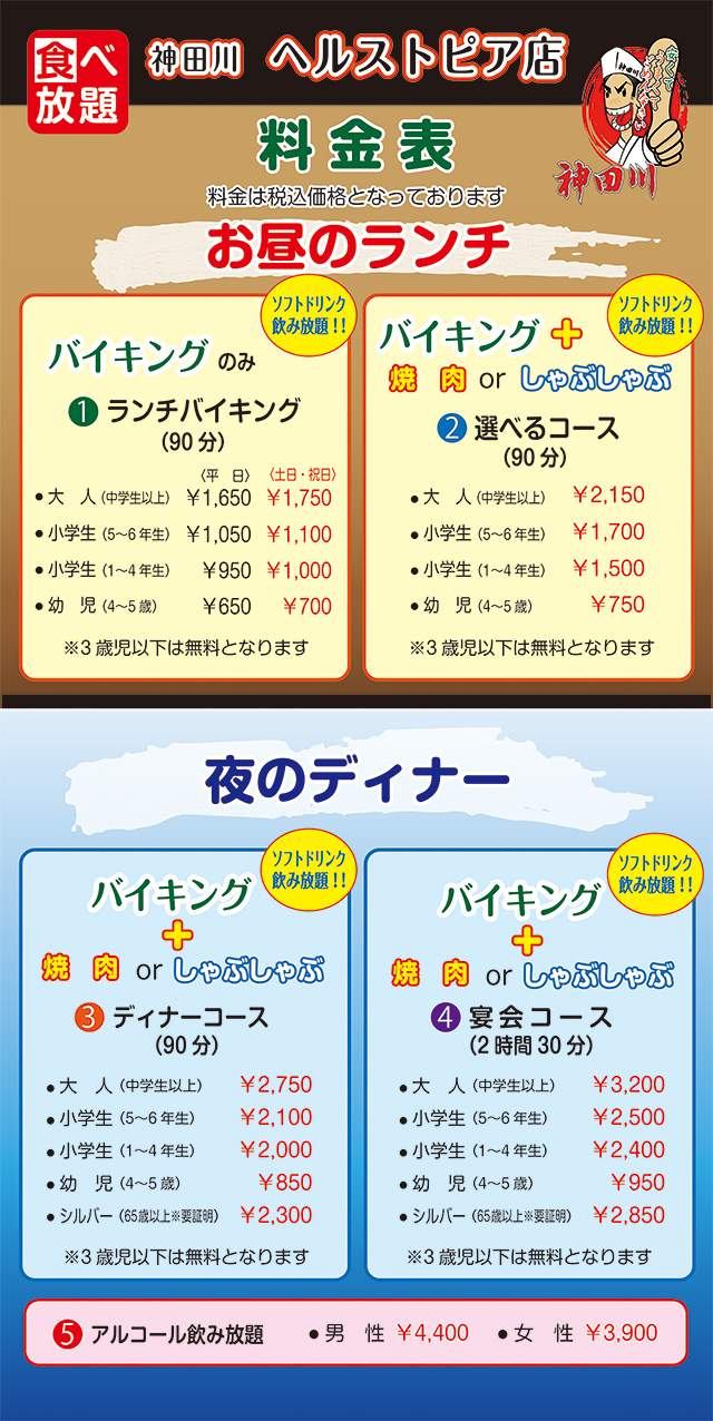 【神田川グルメ館ヘルストピア店料金表】