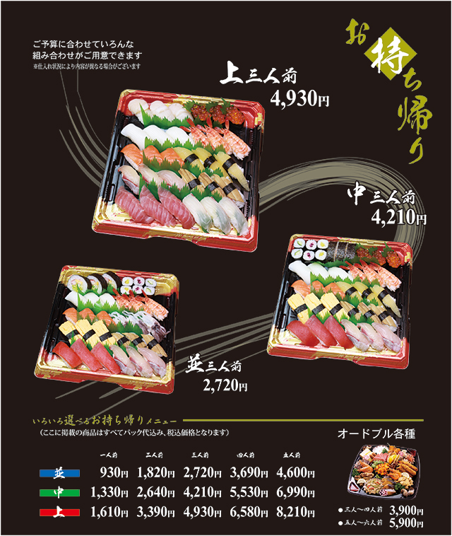 【神田川本店・門川店お持ち帰り寿司料金表】